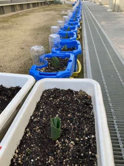 毎朝、登校してきたらお水をあげているチューリップがどんどん成長しています。