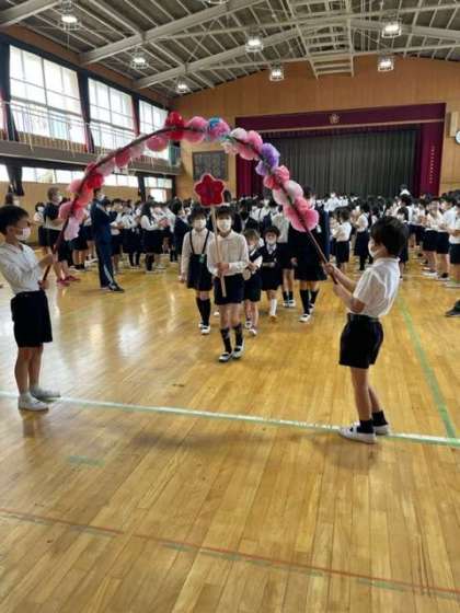6年生が作ってくれたメダルを胸に掛けて、6年生と一緒に新入生が入場しました。