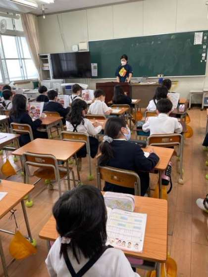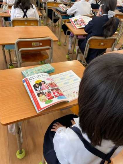 2年生の教室から、楽しい歌声が聞こえてきました。世界の「あいさつ」を交えながら、明るい声で楽しそうに歌っていました。