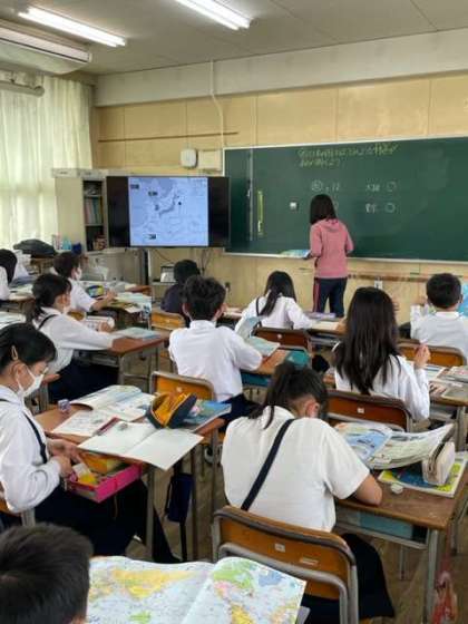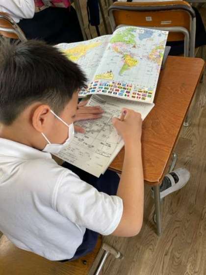 世界地図を見ながら、日本の国土について調べました。高学年になると、調べる範囲が大きく広がります。
