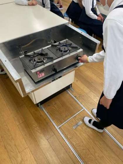 教室でガスコンロの使い方について学習した後、家庭科室で実際に火をつける練習をしました。