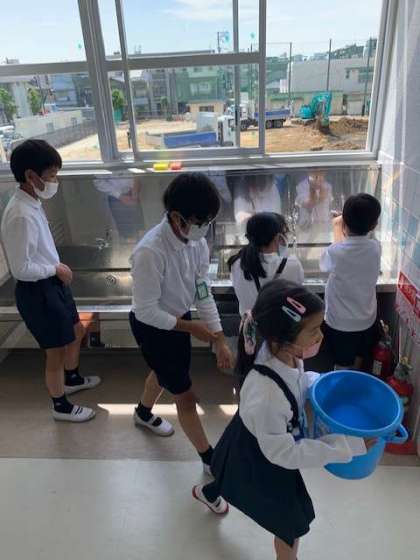 高学年が低学年に雑巾の絞り方を教えている場面も見られ、微笑ましい光景です。