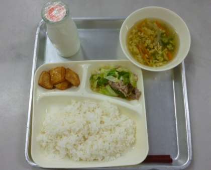 豚肉と野菜のいためもの  かきたま汁 あつあげのみそだれかけ