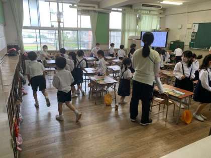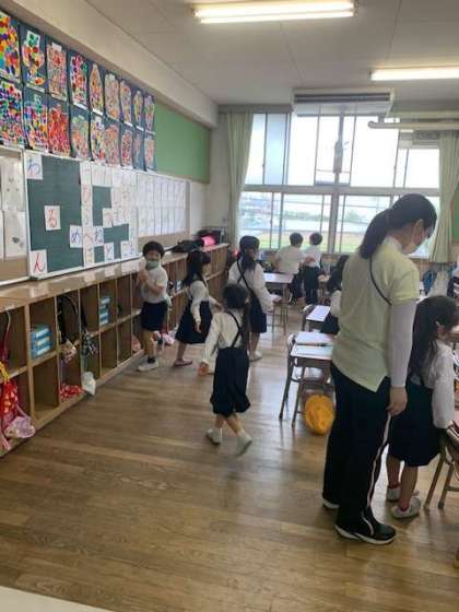 音楽が鳴ると、曲「歩こう」に合わせて歩きます。子どもたちもとっても楽しそうです。