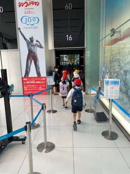 ハルカス到着です。トイレ休憩を終えて、上に登ります。エレベーターは、異次元の世界を想像させてくれる演出で、子どもたちも大興奮です。