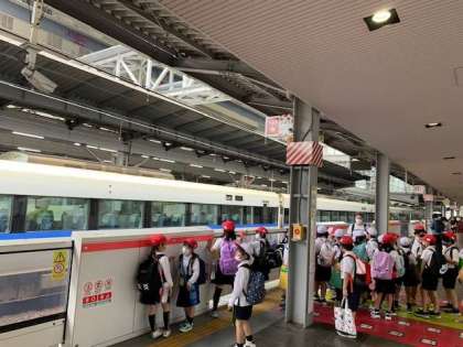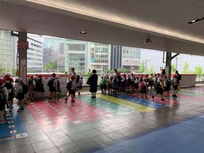大阪駅で下車し、周りの建物がどんなものが多いのか、みんなで確認しています。ここからは、天王寺行きの環状線に乗り換えて学校に帰路につきます。