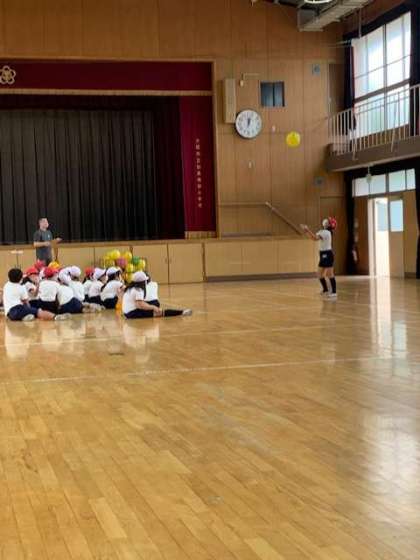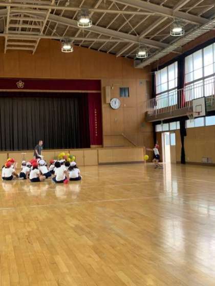 体育館では、3年生がボールを上に高く投げて、落ちてくるまでに拍手を3回して受け取れる。落ちてくるまでにクルッと回転をして受け取れる。テストをしていました。