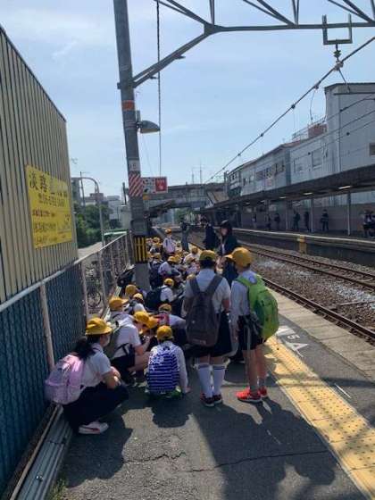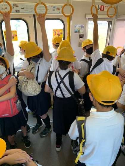 これも校外学習でしか学習できない体験です。鞄を前に抱えることで、自分の荷物の管理と周りの人への配慮をすることができます。