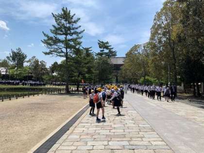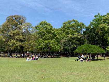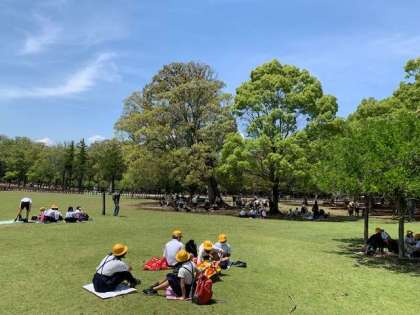 お弁当を食べるために、春日野園地にきました。みんなで一緒に「いただきます」をします。