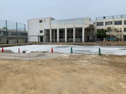 運動場に雨水の貯留槽を埋めるため、掘られた土です。すごい量です。校舎の3階まで届きそうな大きな砂場。