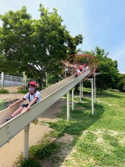 お弁当とおやつを早く食べ終えた児童は、もう一度、公園の遊具に夢中です。