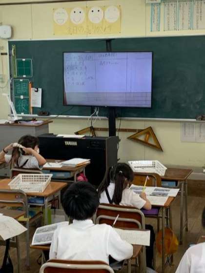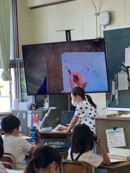 一昔前までは、拡大したものを黒板に貼って、マジックで書き込んで…、教えていたものが、今では大型液晶画面に映し出して教えています。