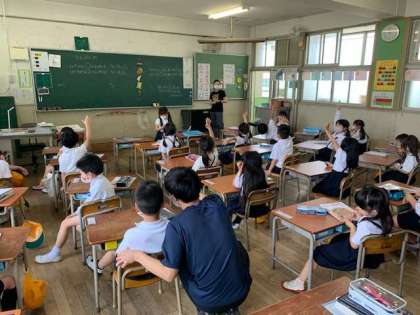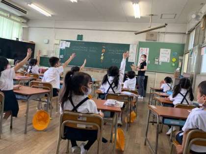 前から○番目、右から○番目の人は、誰でしょうか?と先生から質問されて手を挙げています。