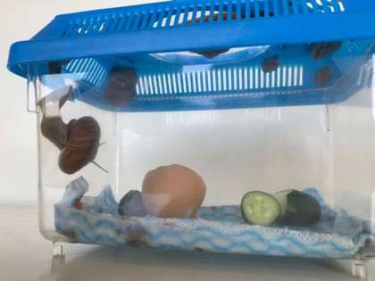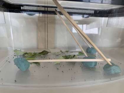 学校裏のキンカンの木にいたアゲハ蝶の幼虫がやってきました。かたつむりやカブトムシの幼虫とともに職員室前に勢ぞろいです。