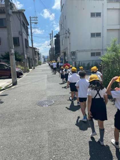 今日の避難訓練は、給食室からの出火と言う想定で、鞍作公園まで避難を行いました。