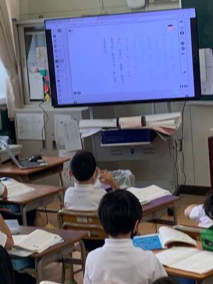 大型モニターの中で、映し出されたデジタル教科書が文字に色をつけて文章を読んでいってくれます。