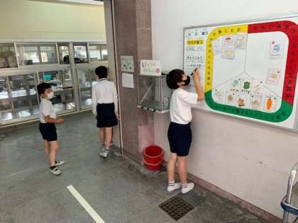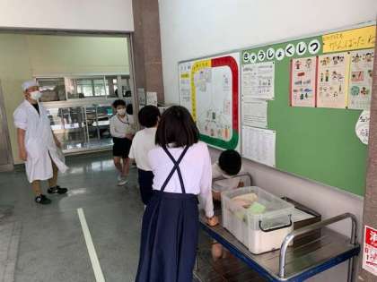 給食室前で給食献立掲示物を作成してくれたり、学級の食缶返却を手伝ってくれます。
