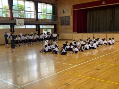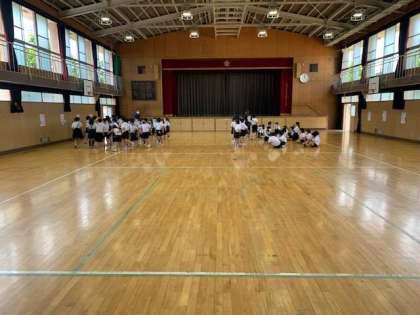 学年で体育館をプールに見立てて、並び方の確認を行なっています。