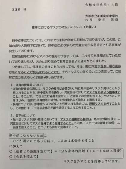 夏場におけるマスクの取り扱いについて(お願い)