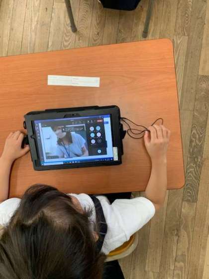 タブレット端末に先生が映し出されただけで歓声があがります。