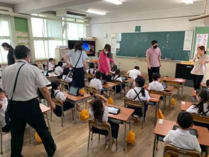 今回の1年生のタブレット端末使用にあたり、大阪市教育センターICT支援員3名、いつも来ていただくICT支援員1名の方に手伝っていただきました。