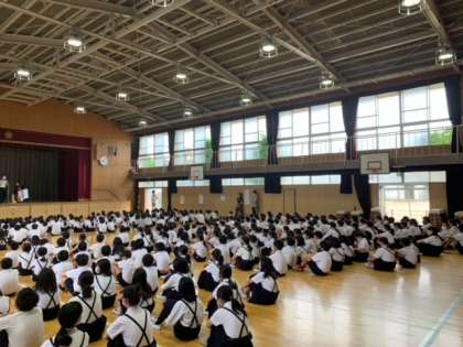 毎週月曜日は、全校朝会です。窓を全開にして全児童が集まります。