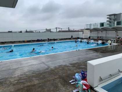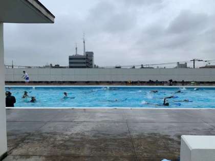 ビート板を使い、バタ足で25メートルを泳いでいます。しっかりと水を蹴れて入れれば前に進みます。