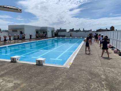 気温も上がってきて、水はぬるいくらいです。子どもたちからも「プール気持ち良い」と声が上がります。
