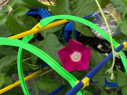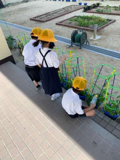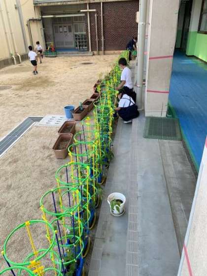 1年生が育てているアサガオがちらほらと花を咲かせてきました。