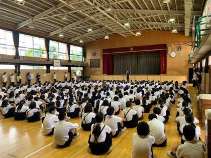 月曜日は、全校朝会です。朝から気温が高いですが、換気をしながら短時間で集まりました。