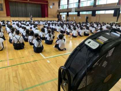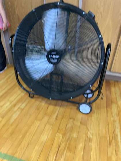 大型サーキュレーター(扇風機)を使って、換気と暑さ対策です。今朝は雨なので、そこまでとっても暑いことはないですが、熱中症対策にも気をつけています。