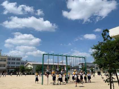 陽射しが厳しいので、帽子は必須で、マスクは外します。(気になる子はつけています。)休み時間が終わったら、教室に戻って必ずお茶をのみます。
