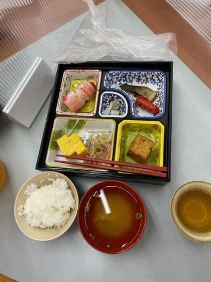 朝は食堂で朝食を食べました。