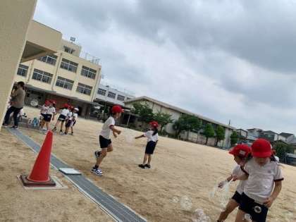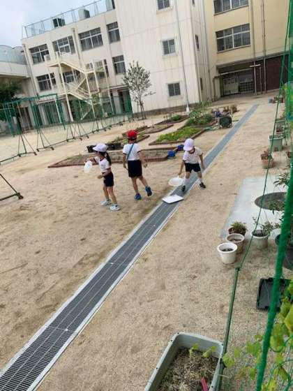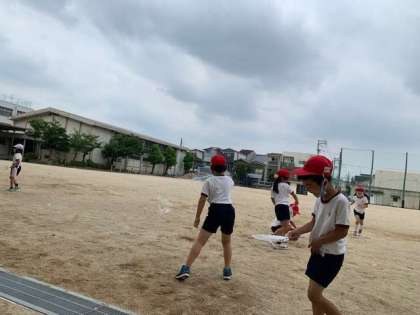 シャボン玉遊びをしています。うちわを再利用して、できるだけたくさんのシャボン玉を飛ばします。