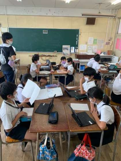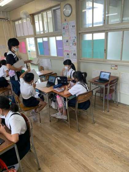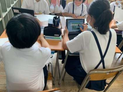 タブレットを使って、まとめてきたことをプレゼンテーションしています。