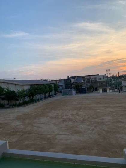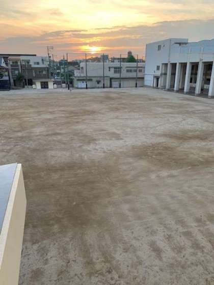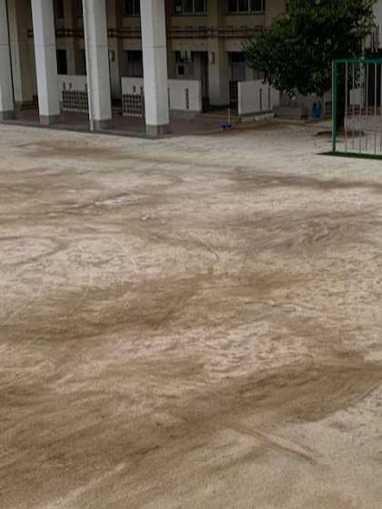 運動会の練習が、明日から始まる学年もあります。本格的に運動場を使用する前に、全教職員でにがり(塩化マグネシウム)を撒きました。
