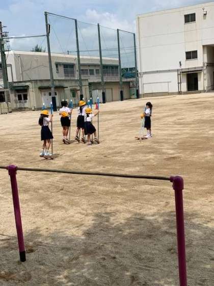 運動場で使用可能となりました。低学年児童も高学年児童も工事中は、触れなかったので、興味深々です。