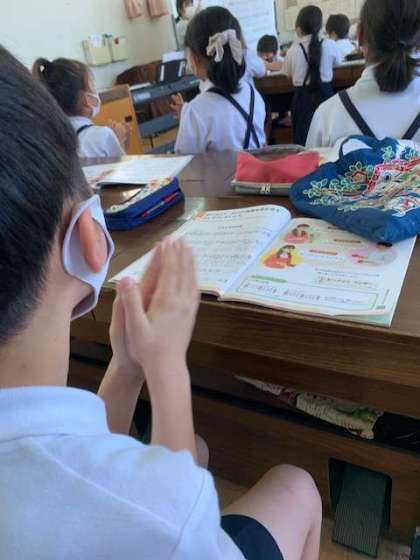手拍子で、リズムの確認をしています。ボディーパーカーションで音楽を奏でているようです。