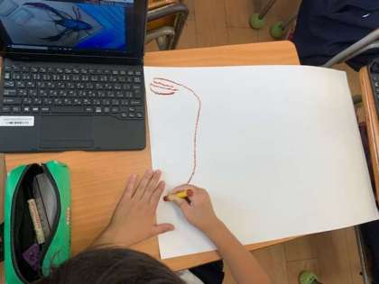 ザリガニの画像を見て、描いていきます。どこから描こうかなっ??と迷う子どもたち。はみ出てもいいと言われてダイナミックに描いていきます。