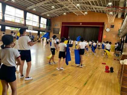 講堂では、自主練習をしています。フラッグの動き、音を確認です。