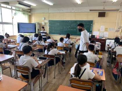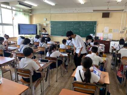 教育実習生が、算数科の授業を行なっていました。指導にあたる教職員が4人入って子どもたちのフォローや実習生の指導にあたります。