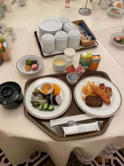 ハンバーグにエビフライ、チキン、ツナの巻き寿司、サラダにフライドポテト、デザートにプチケーキもありました。