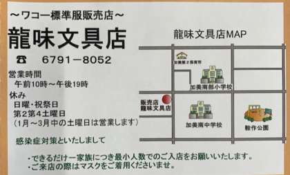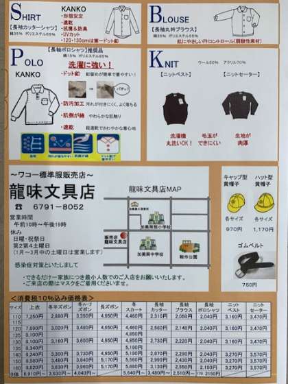 ○学校での「標準服予約注文日」以降は、龍味文具店でご注文できます。