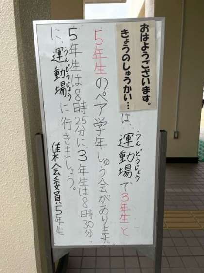 本日の始業前に、3年と5年の「ペア学年集会」が行われました。