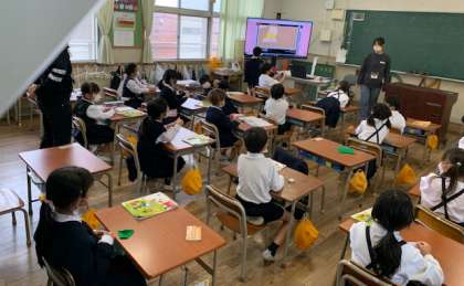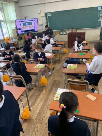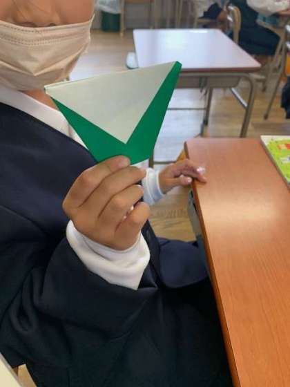 折り紙で、容器を作っていました。画面で先生の手元を写して一緒に制作していきます。