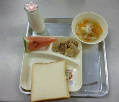 豚肉のカレー風味焼き じゃがいものスープ すいか パン(食パン) 牛乳