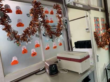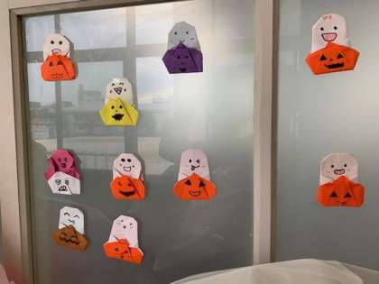 校内を見て回っていると、あるクラスでは季節の掲示物が教室外にされていました。一人一人違った顔です。ここにも子どもたちの個性が溢れています。