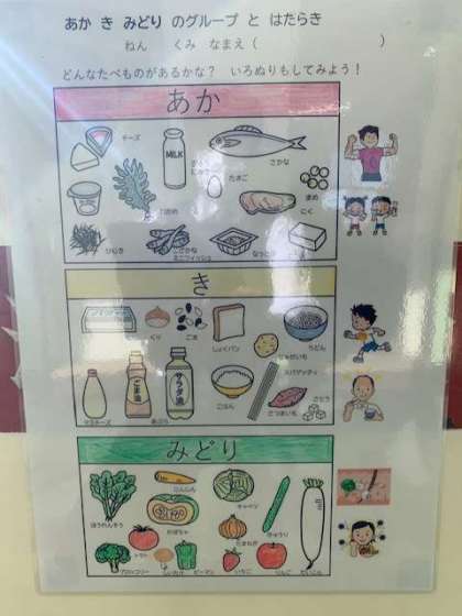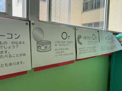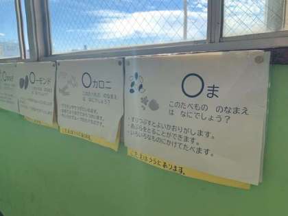 一年生の廊下前には、栄養教諭に教わった食べ物クイズが掲示されています。一枚めくると答えが出てきます。