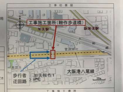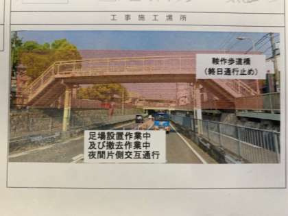 歩道橋は、11月上旬から工事終了まで終日通行止めとなり、信号へと迂回することになります。