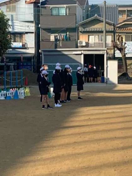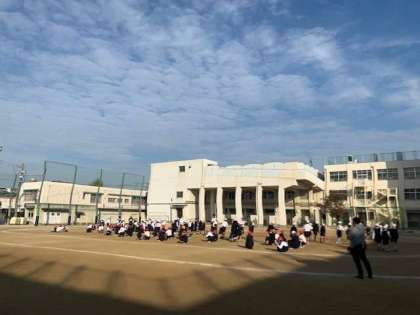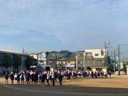 今朝の児童集会は、3年生と5年生のペア学年で行いました。異学年グループでどれだけ早くボールを回すかを競いました。